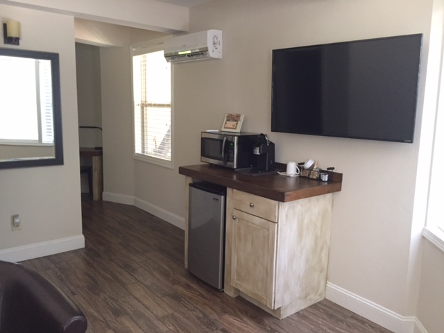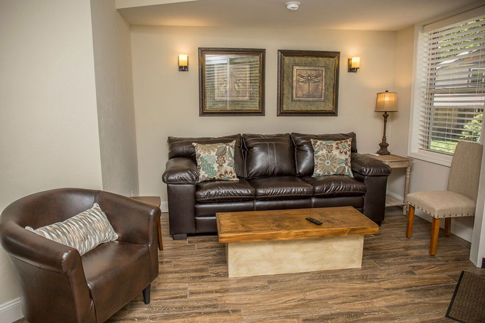 Amenities: Our King Suites feature king bedrooms with an adjoining sitting area. The seating area is furnished with a couch and chairs, a 50-inch flat screen TV, a mini refrigerator and a k-cup coffee maker. Each Suite also has a private bath with a granite double vanity and a walk-in tile shower.